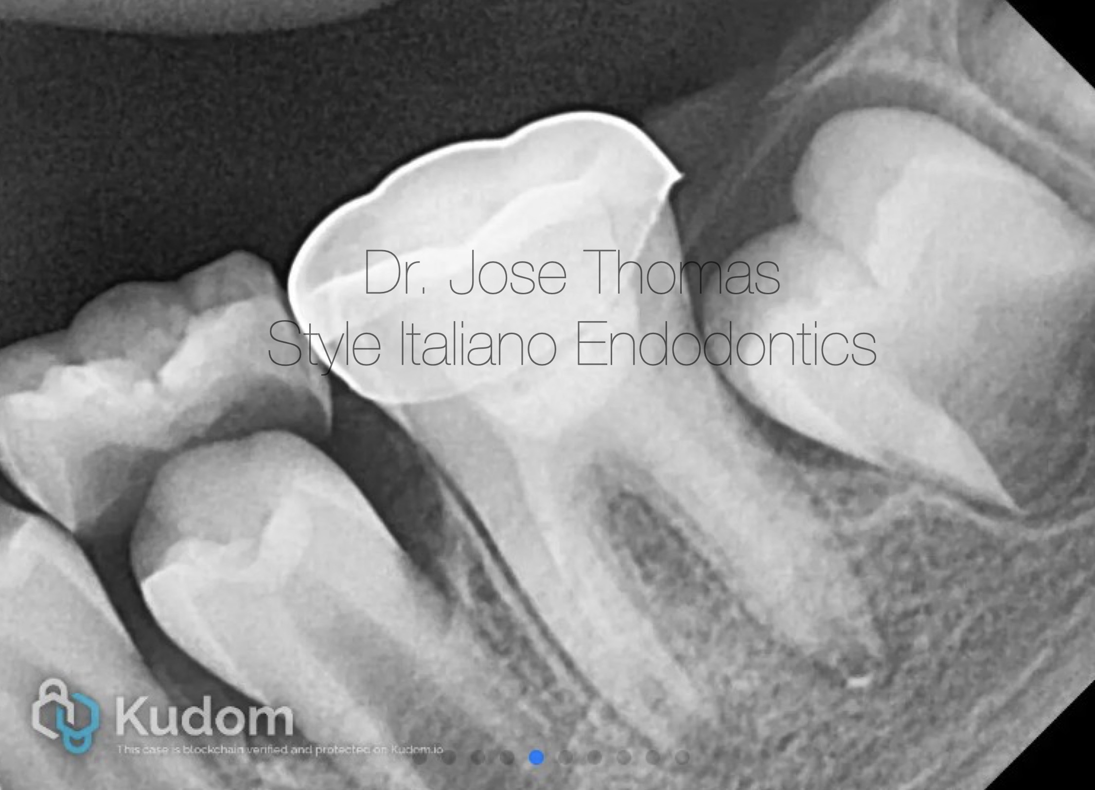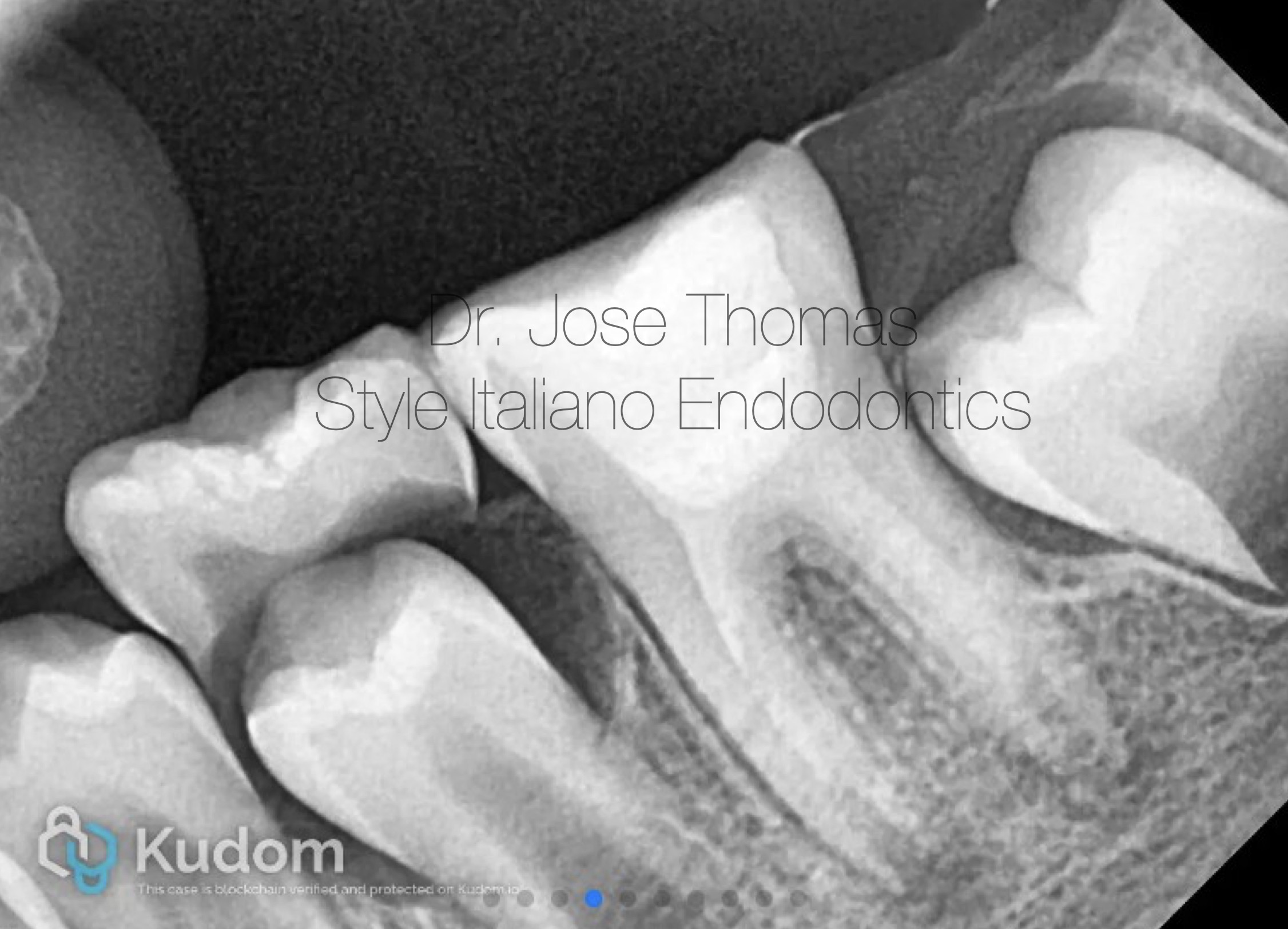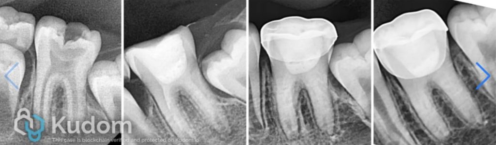 The canals and chamber were then thoroughly dried with paper points and Biodentine® (Septodont, Saint-Maur-des-Fossés, France) was placed into the canals and up to the working length in small increments and gently condensed with a hand plugger. A resin modified GIC liner was used to close off the canal orifices, followed by restoration of coronal seal with composite build-up. Radiograph of 36 showing Biodentine® in canals and access closed with composite.