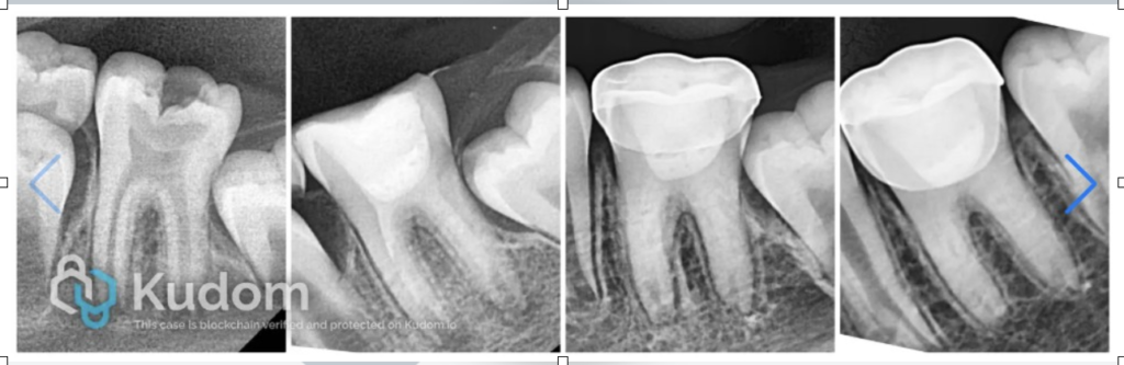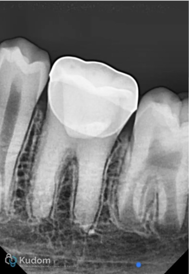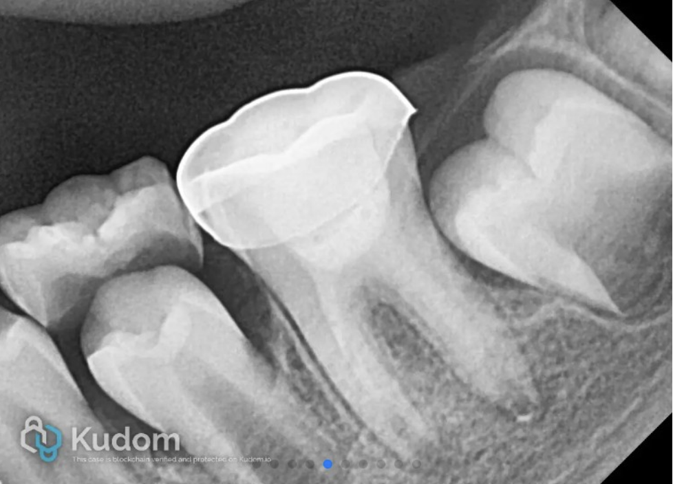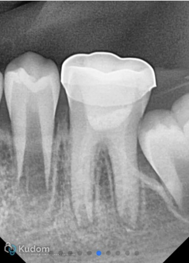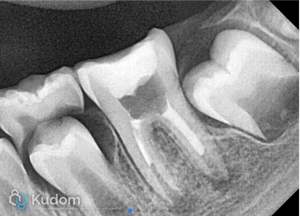 The X-ray shows deep carious lesion in tooth 36. The root length is nearly complete with wide open apical foramina and indistinct apical lamina dura around both mesial and distal roots.