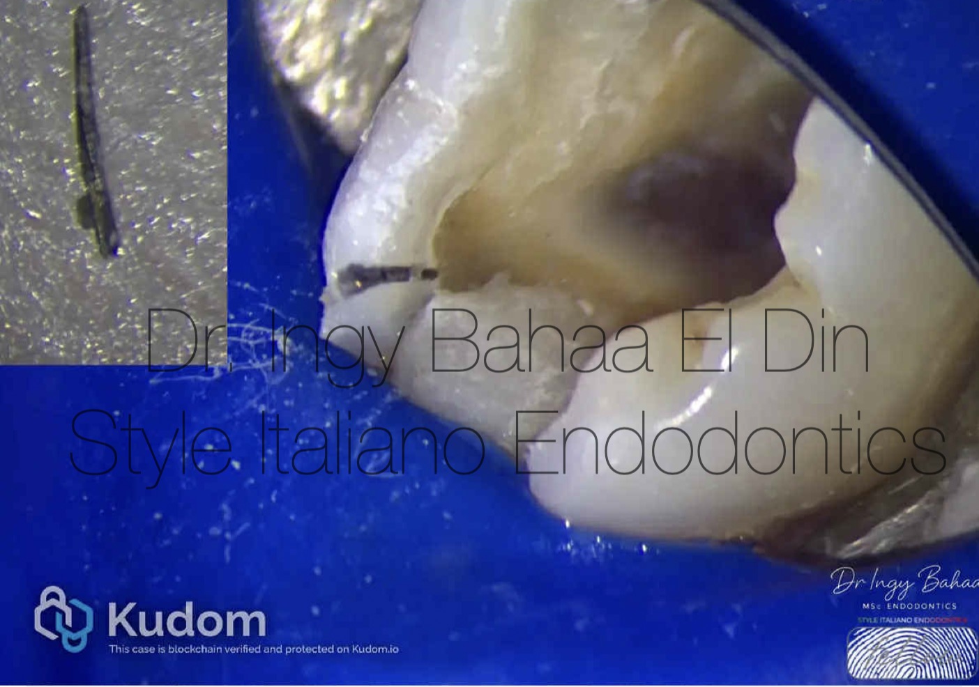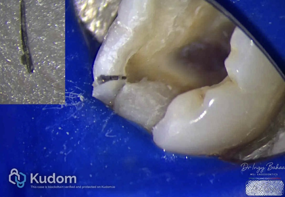 Moving on to separated instrument number two, we had two challenges Number 1 : Risk of extrusion due to file engagement apically. Number 2 : Separation of file is beyond the curve which doesn’t give much visibility for troughing , Thus: Conservative Bypass was decided. With a Pre-bent D finder file size 10 in picking motion, a catch was found. Proceeding with 10 k file in watch-winding motion until patency was achieved