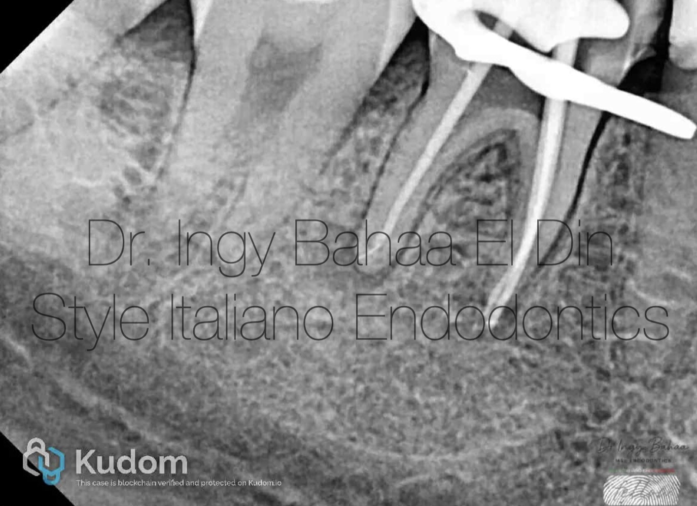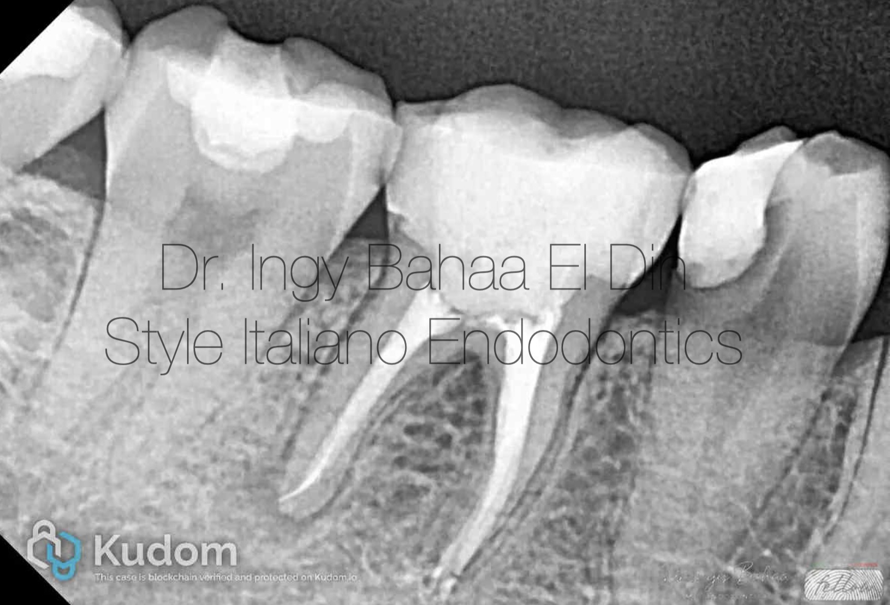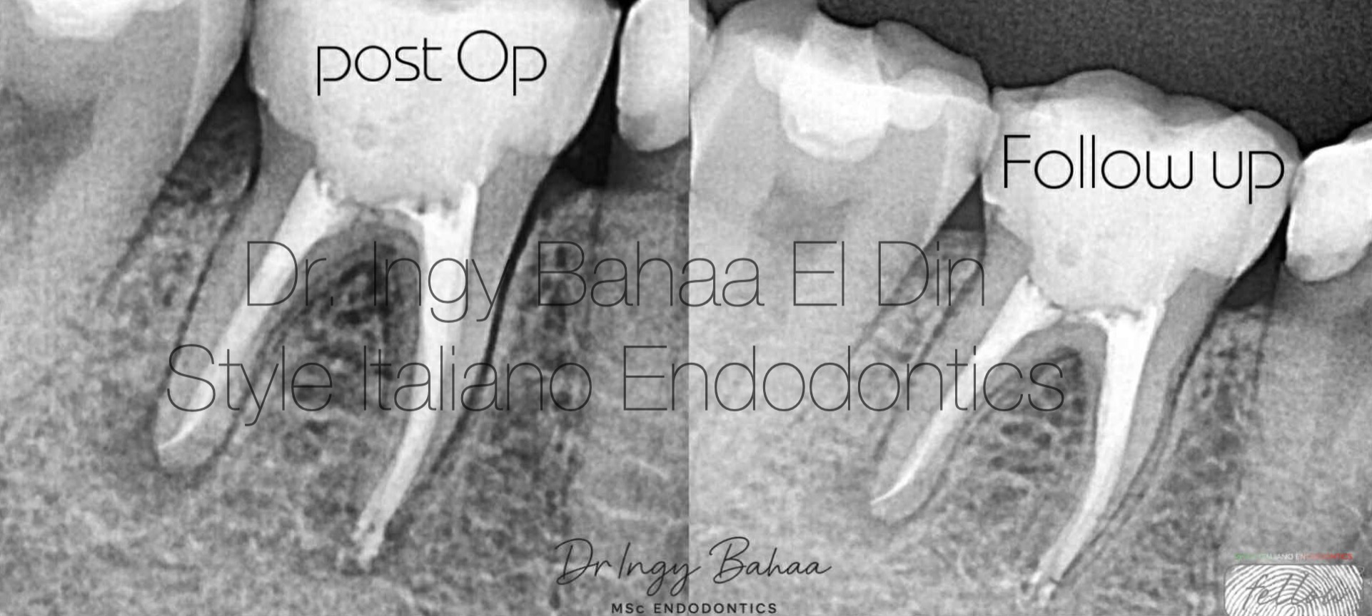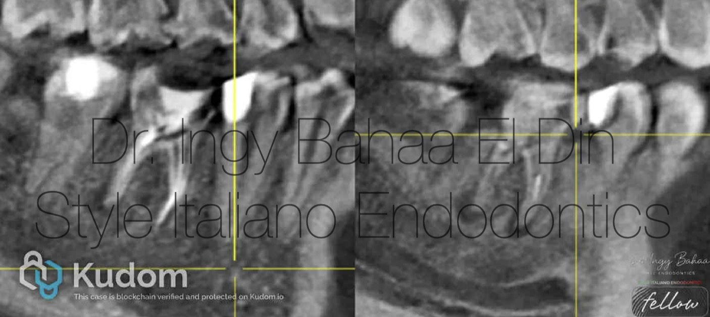 Case:  Referred 25 years old patient came to our clinic with pain on Biting related to lower right first molar , stating a previous endodontic treatment done a year ago with pain on biting ever since. A Periapical Radiographic Xray (  fig1 ) showed obvious widening in lamina dura around mesial and distal root and mild abscesses related to mesial and distal roots .