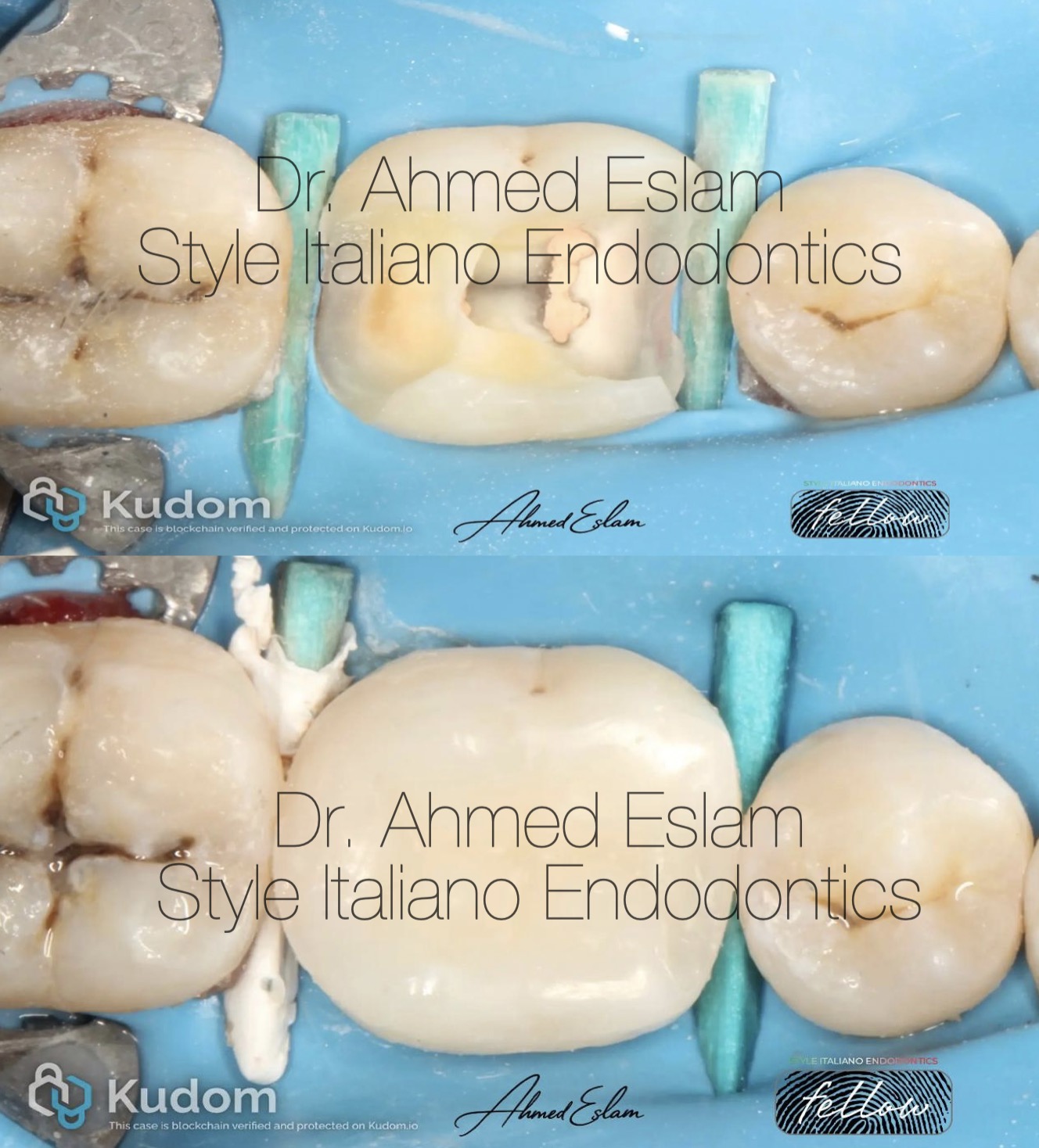 Master cones were selected, fitted precisely to working length, and verified radiographically to confirm proper adaptation. Obturation was carried out using the warm vertical compaction technique with a bioceramic sealer, ensuring complete three-dimensional sealing of the complex canal system.