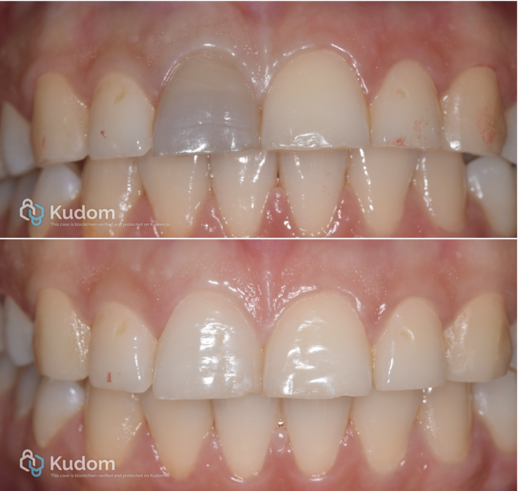 The patient’s dental history revealed a previous traumatic incident involving the affected tooth approximately seven years earlier, which likely contributed to the subsequent discoloration.