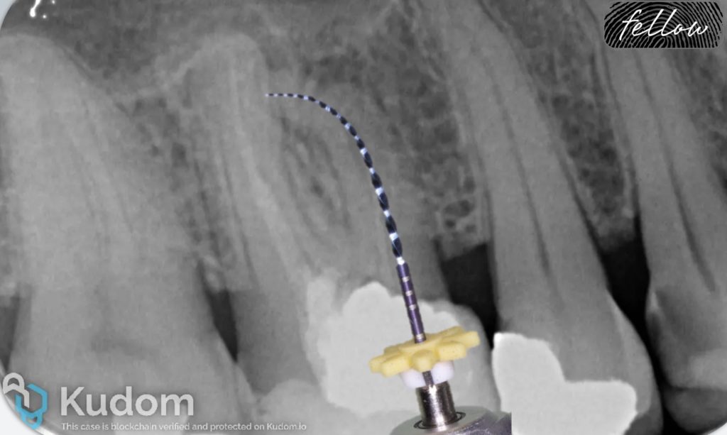The following geometrical characteristics of the distal root on tooth #46 with previously initiated therapy in a 37-year-old female patient are reported on the preoperative x-ray: Angle > 25o, small radius and length of the arc, location 1-2mm from the radiographic apex.