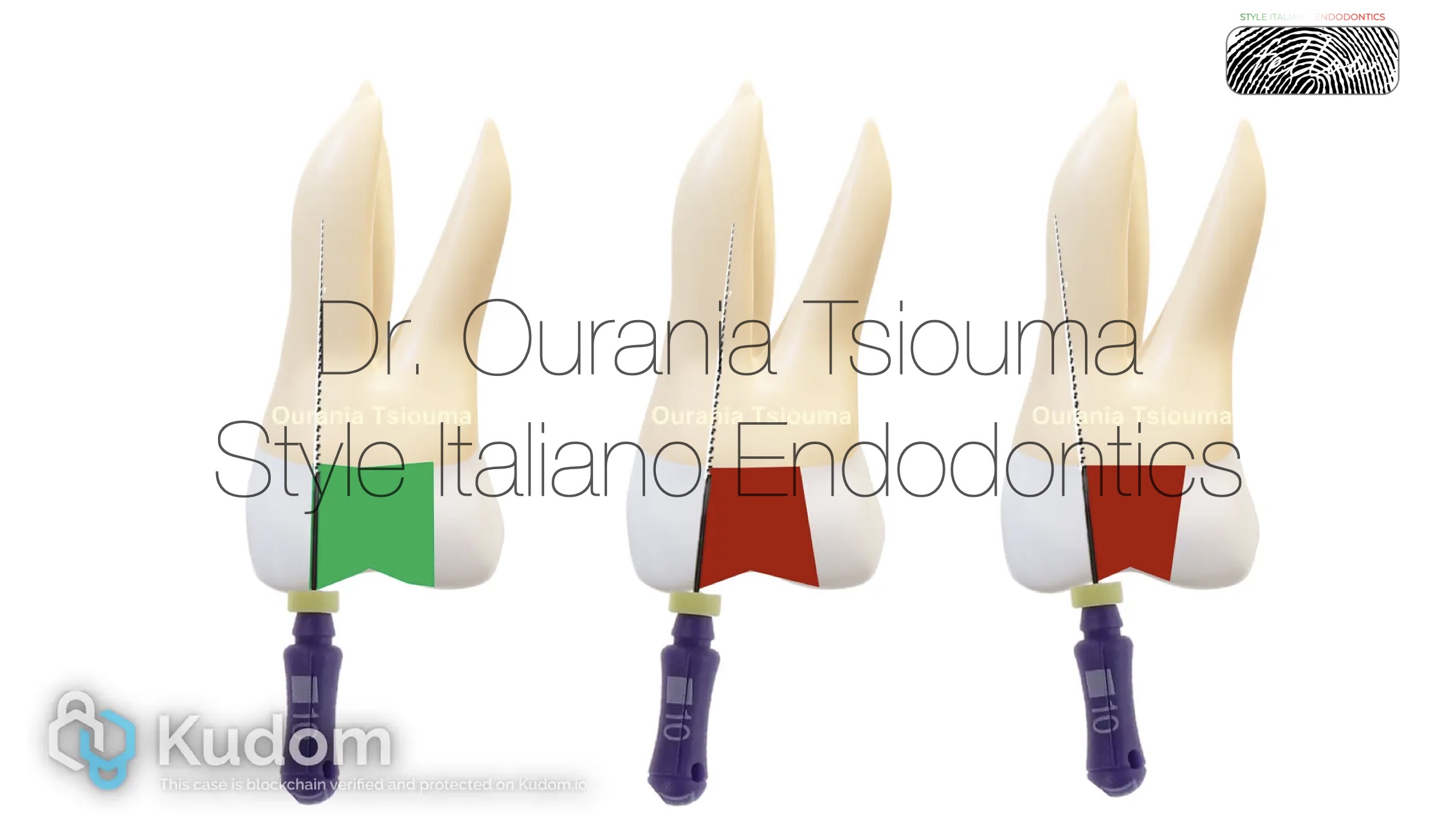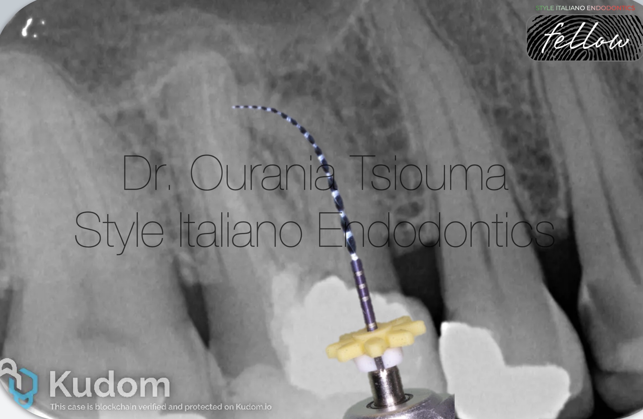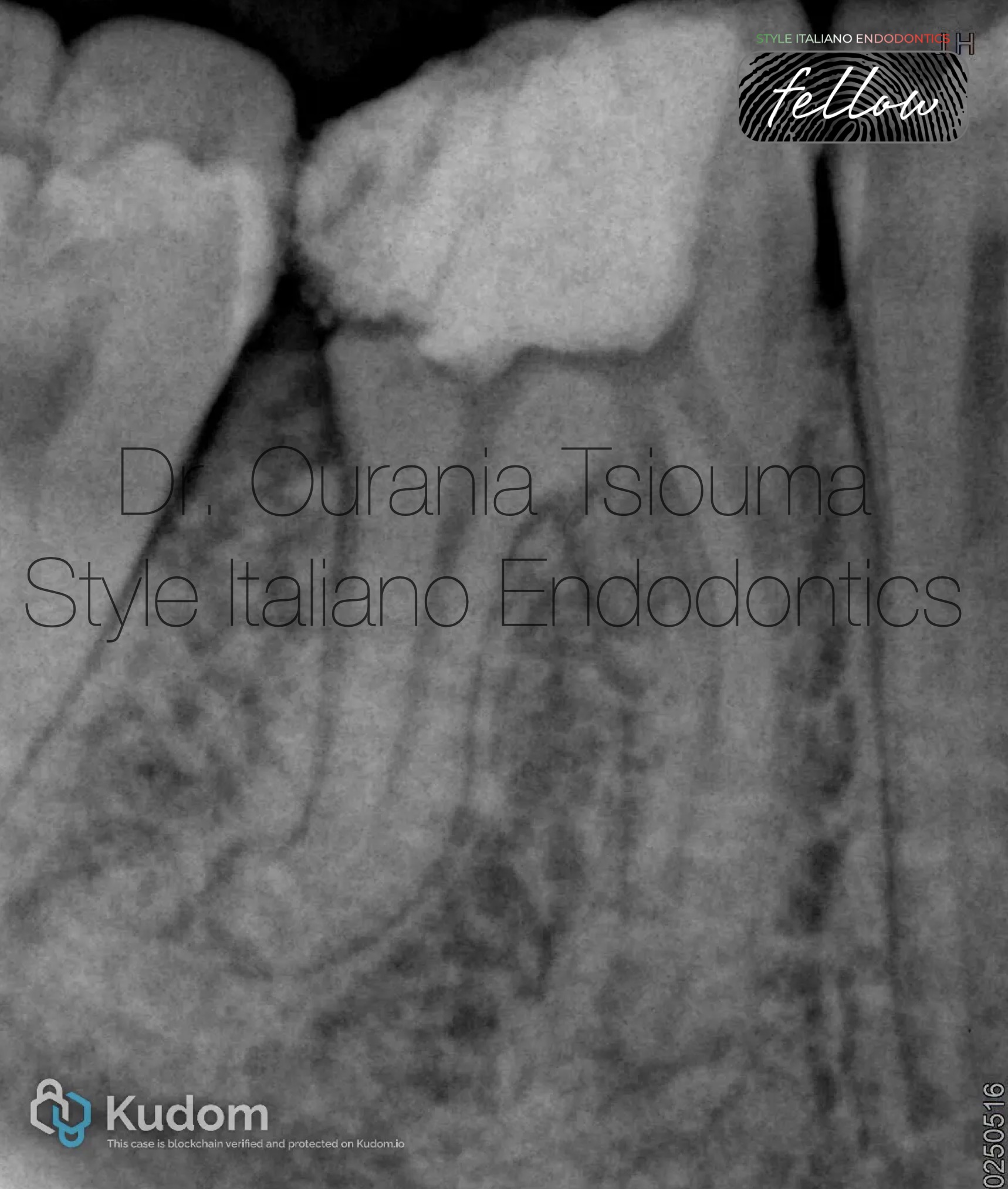 Two preoperative x-rays with different horizontal angulation in a case of a previously treated #16 in a 46-year-old female patient with symptomatic apical periodontitis depicted better the tooth’s anatomy. In particular, the x-rays not only revealed that the mesial root is curved 3-4mm from the radiographic apex, but also that a straightening and perforation of the mesial root canal may have taken place (straight radiolucent line prior to the curvature).