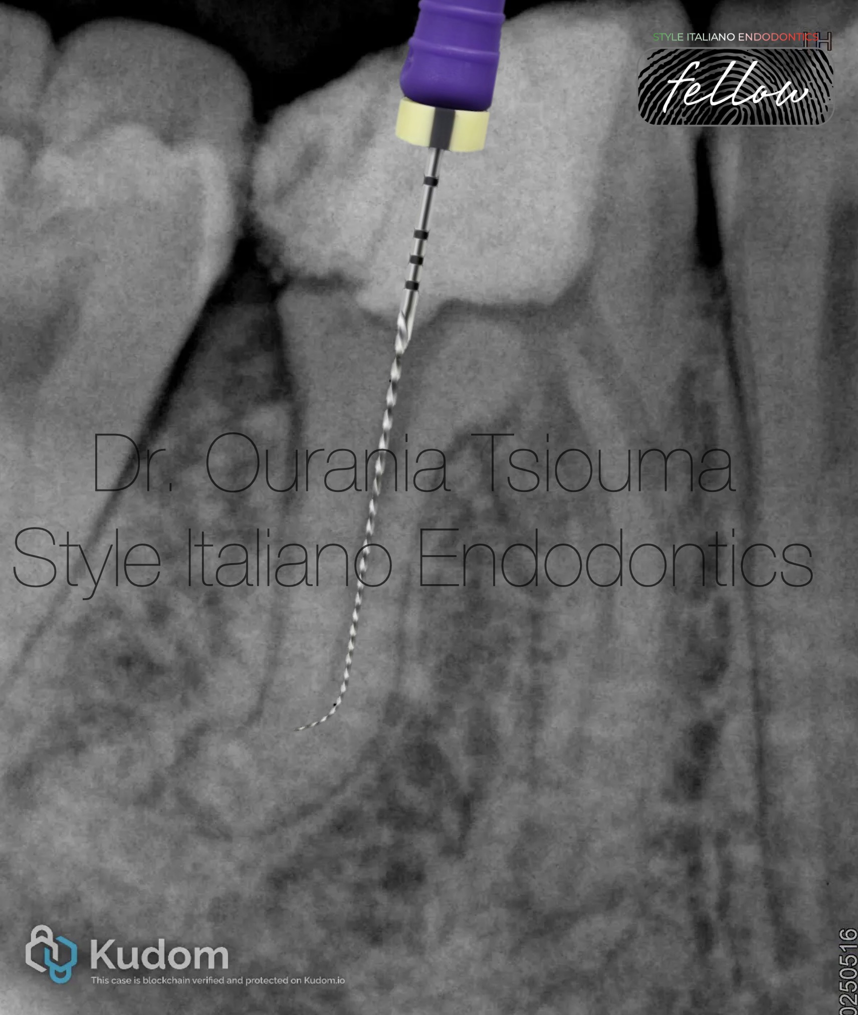The following geometrical characteristics of the distal root on tooth #46 with previously initiated therapy in a 37-year-old female patient are reported on the preoperative x-ray: Angle > 25o, small radius and length of the arc, location 1-2mm from the radiographic apex.