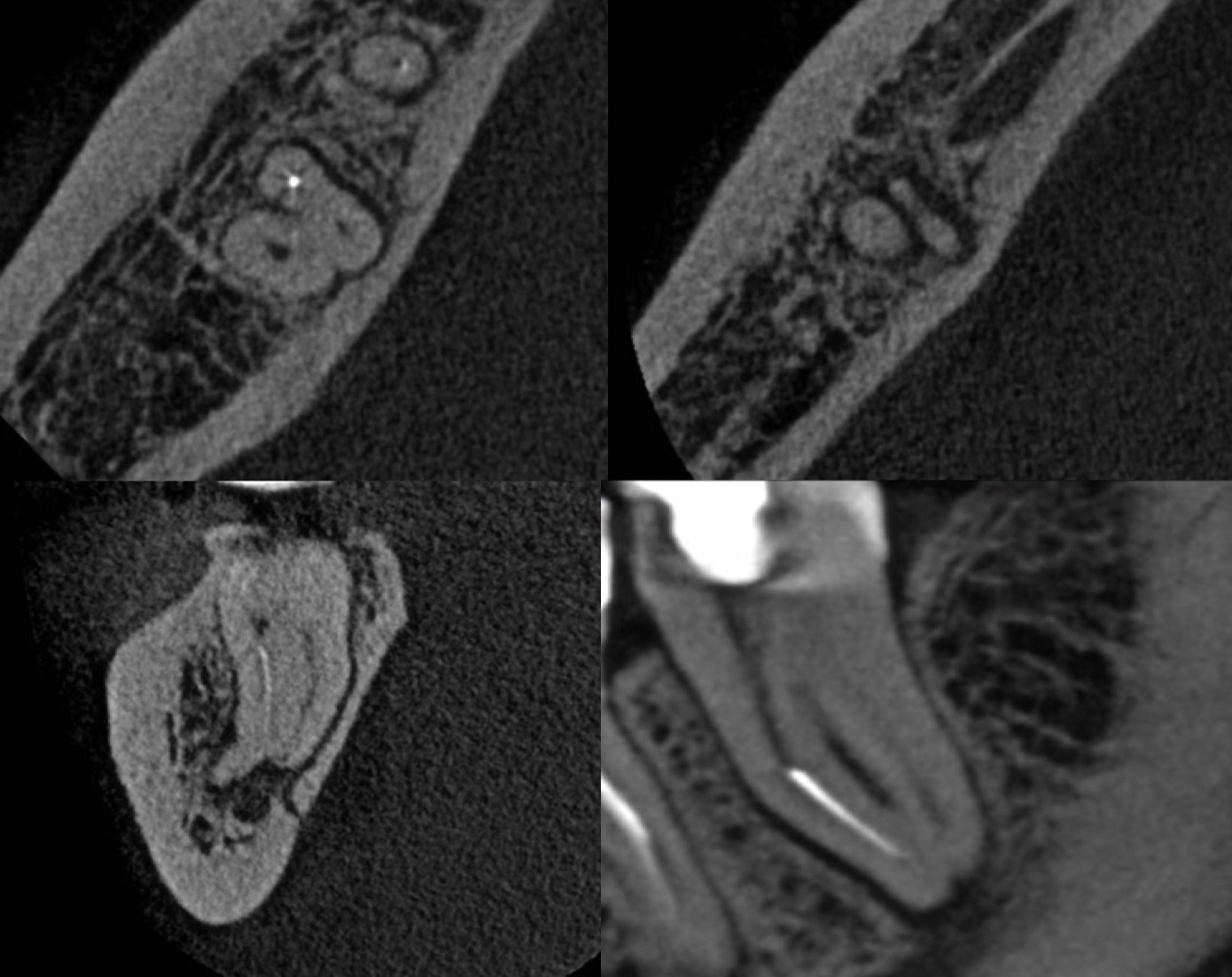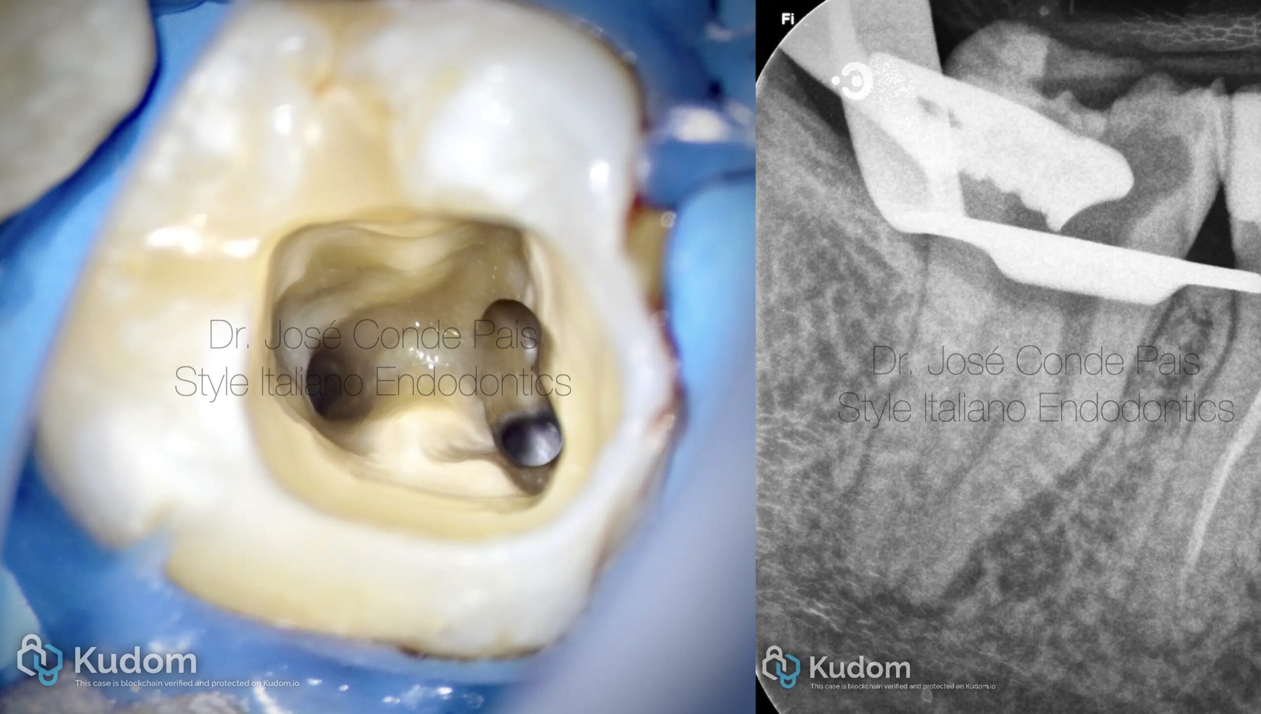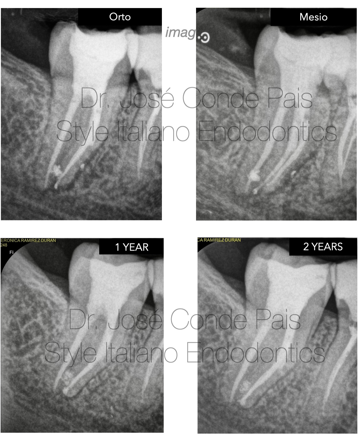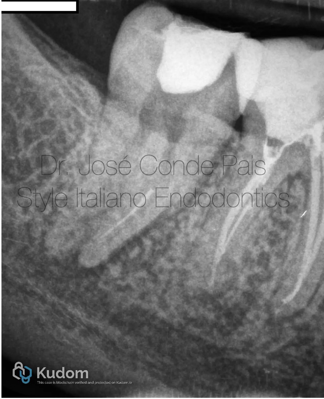 An angled radiograph was also taken to better assess the complexity of the mesial root system and confirm the quality of the treatment.