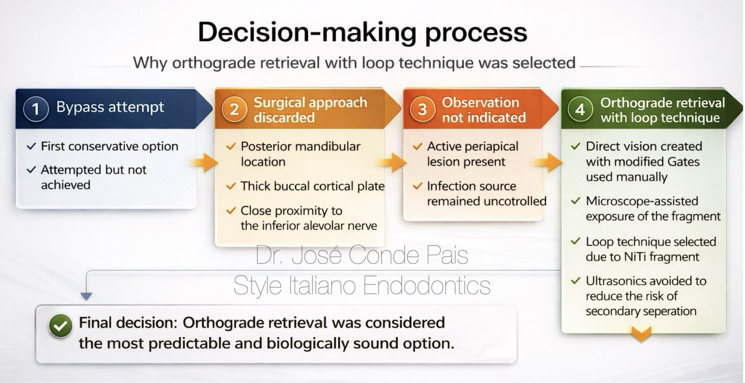 Fractured instruments remain a major challenge in endodontic retreatment, particularly when located beyond canal curvature. This case describes the orthograde removal of a separated instrument in the mesiobuccal canal of a mandibular molar using a loop technique, after CBCT-based diagnosis and critical decision-making. Alternative approaches, including bypass, apical surgery, and extraction, were evaluated and discarded. After successful retrieval, the root canal system was disinfected and obturated using a three-dimensional approach. Two-year follow-up confirmed complete periapical healing. This case highlights the importance of case selection, magnification, and controlled dentin removal in achieving predictable outcomes.