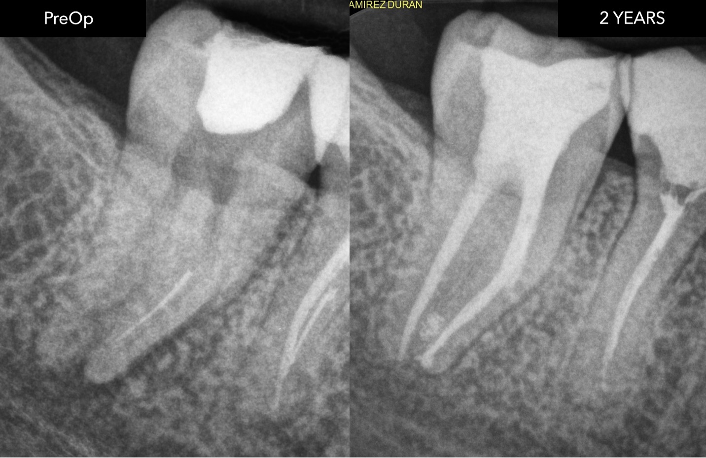 At 2 years, complete radiographic resolution of the lesion is evident, confirming long-term success.