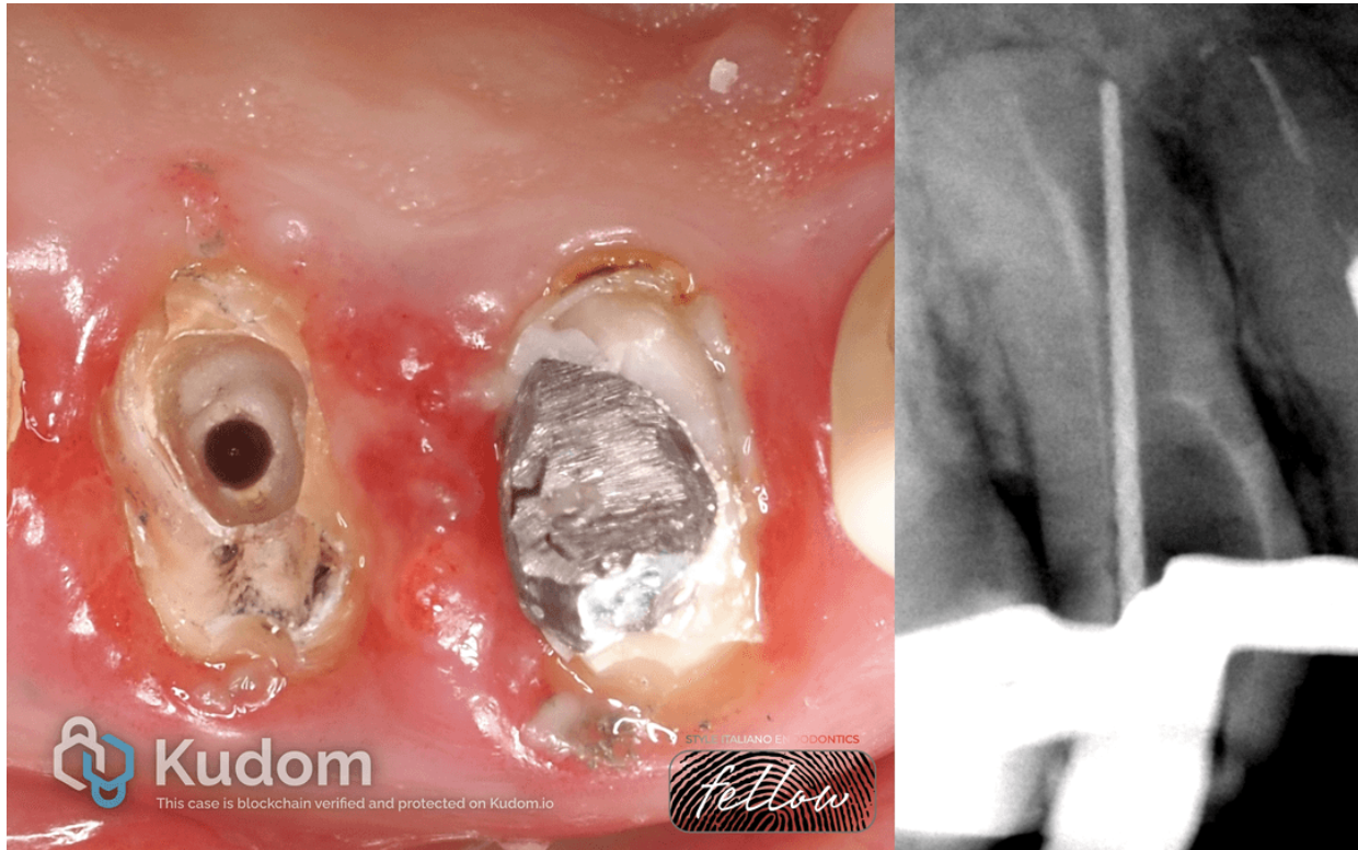 The figure shows incorrect treatment protocol planning and very aggressive root canal preparation for metal intraradicular posts, which subsequently led to a root perforation in the apical portion