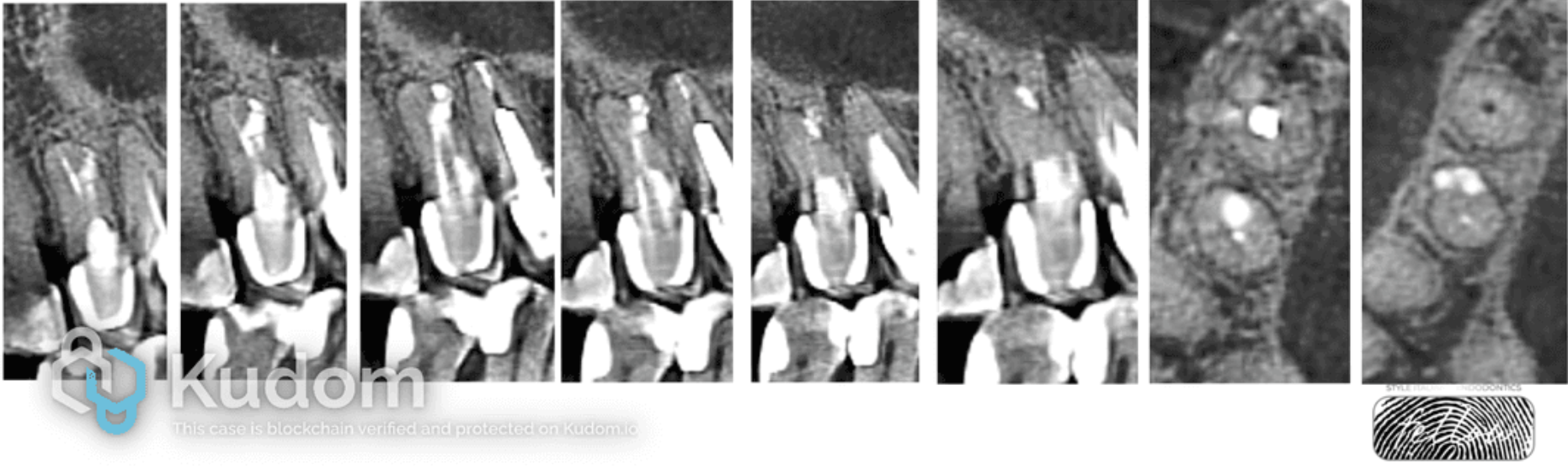 After 5 years, a CBCT scan was performed, revealing complete elimination of the pathological focus with restoration of the lamina dura and a normal periodontal ligament space around the entire root perimeter. This indicates the successful outcome of the ROOT-CROWN-TISSUE concept.