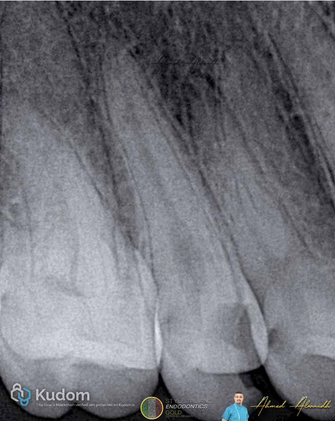 Post obturation IOPA showing 3D obturation of the root canal system filling the two POEs
