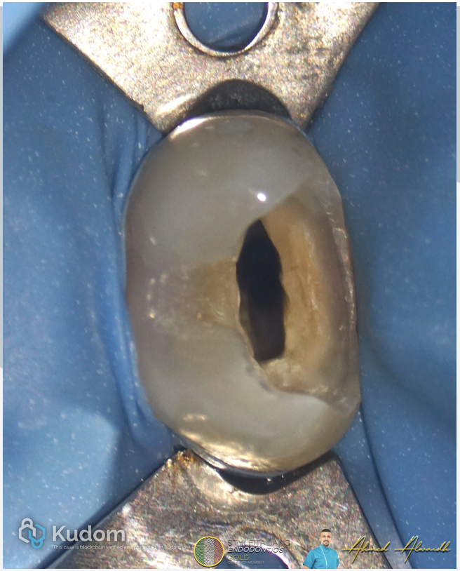 IOPA showed UR5 with deep decay, and single wide canal that suddenly becomes narrow at the apical third, suggesting a split, which needs to be confirmed clinically.