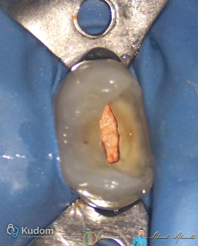 After infiltration anaesthesia and rubber dam isolation, access to UR5 revealed hyper inflamed pulp tissue. Single canal been prepared to #25/06 with two POEs (portal of exits) that were negotiated and prepared. NaOCl 3%, EDTA 17%, PUI