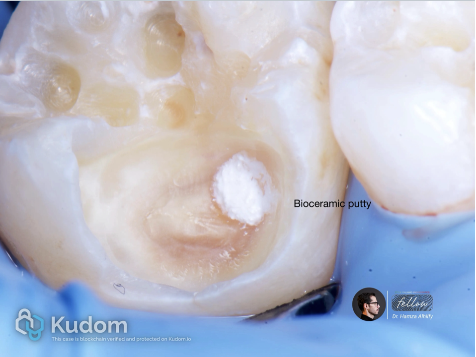 Bioceramic putty applied directly on the pulp tissue closing all the the exposure site and adapted with damp cotton piece.