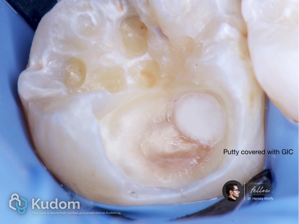 I covered the putty with resin  modified GIC. The tooth now ready for the restoration.