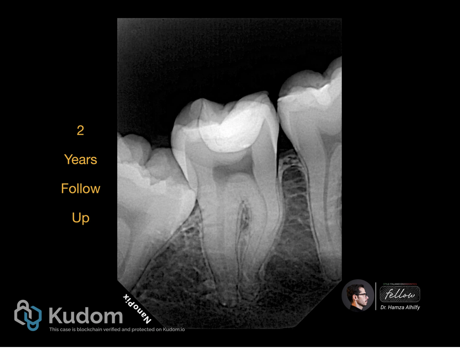 Two years follow up PA x-ray shows normal periapical area with no pathology signs. And the tooth has a normal response to cold test.