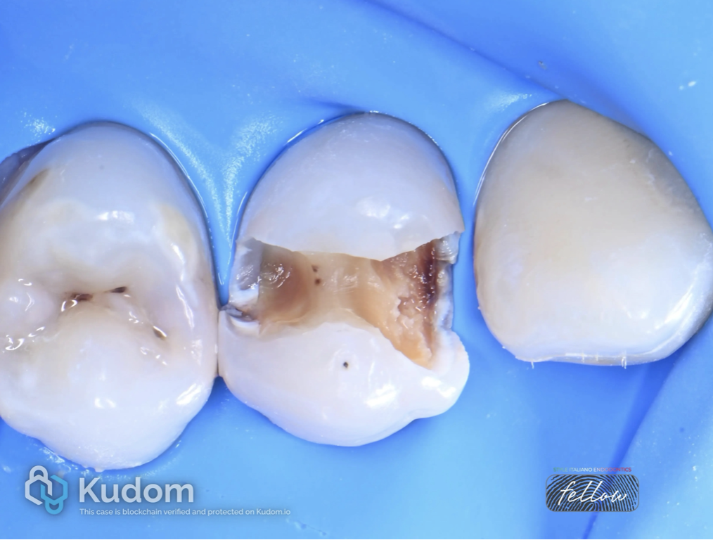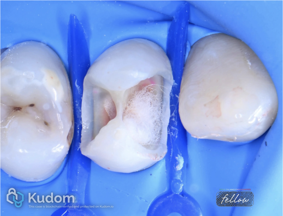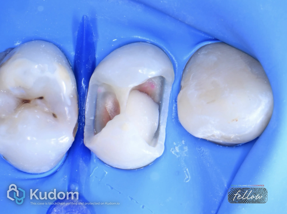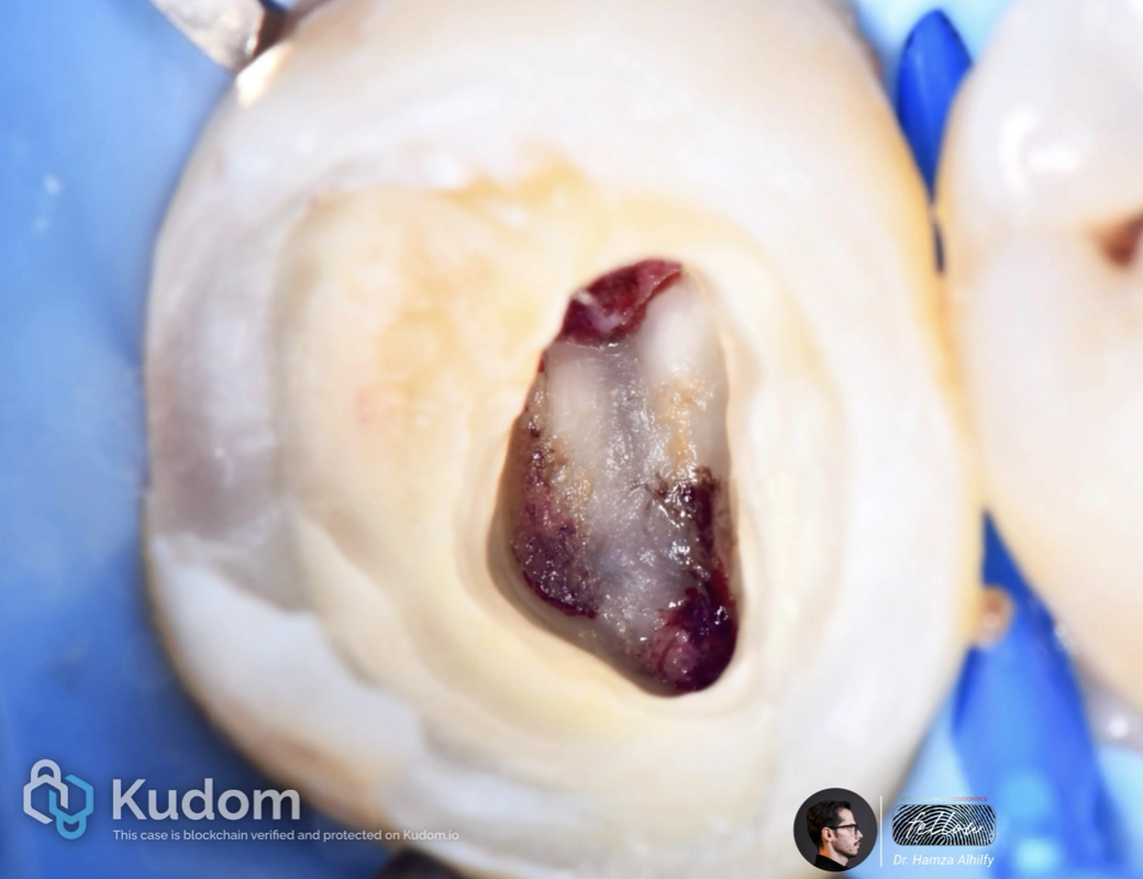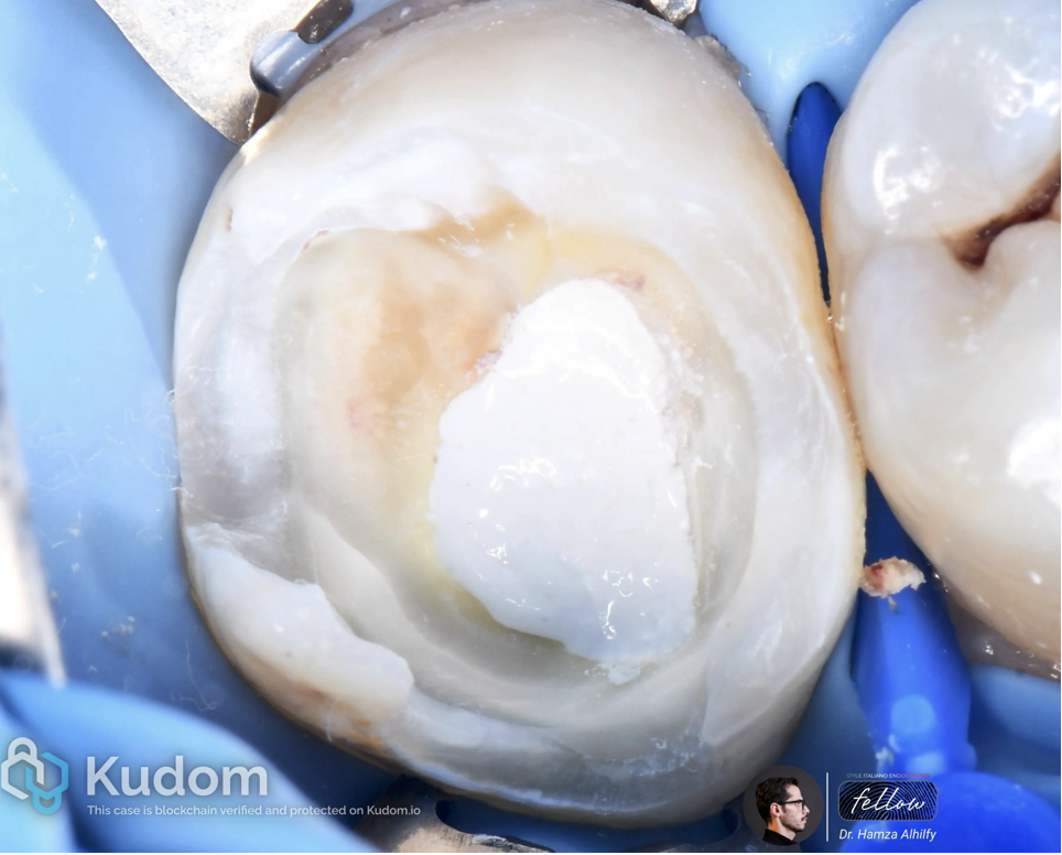 After anesthesia and rubber dam isolation I began removing all carious lesion and unsupported enamel starting from the peripheral areas away from the pulp horns step by step heading to the pulp horn area that is covered with infected dentin.