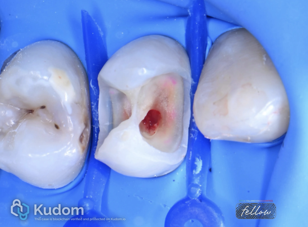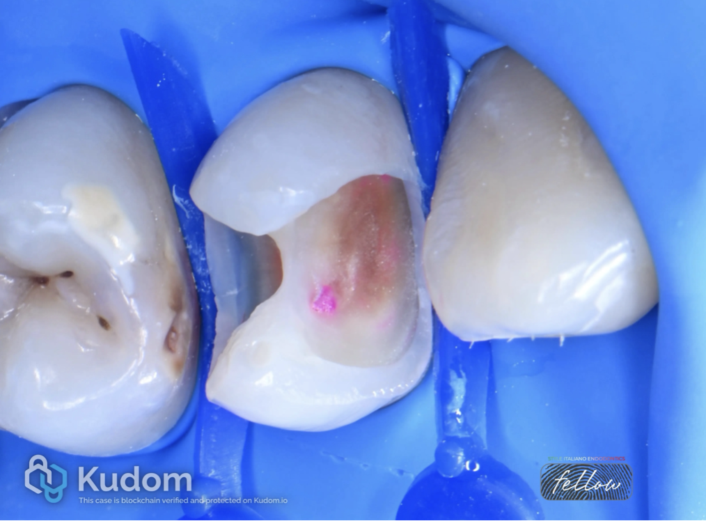 As the picture shows, the pulp exposed(pin point exposure) at the area of mesio buccal pulp horn.