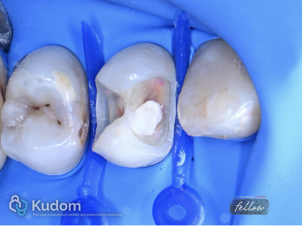 Then the bc putty covered with resin modified GIC. And now the tooth is ready to receive the final fiiling.