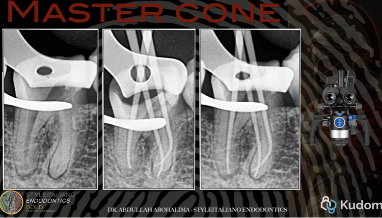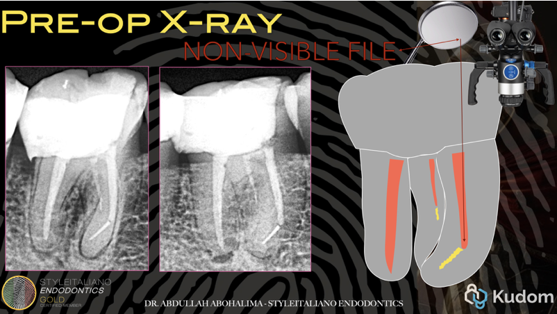 This patient came with two broken files: one in the ML canal, which was short and relatively easy to remove, but the canal underneath was very narrow and blocked. The other one was in the MB canal, and this was much harder, because the file was fractured beyond the curve, which made it a non-visible file.